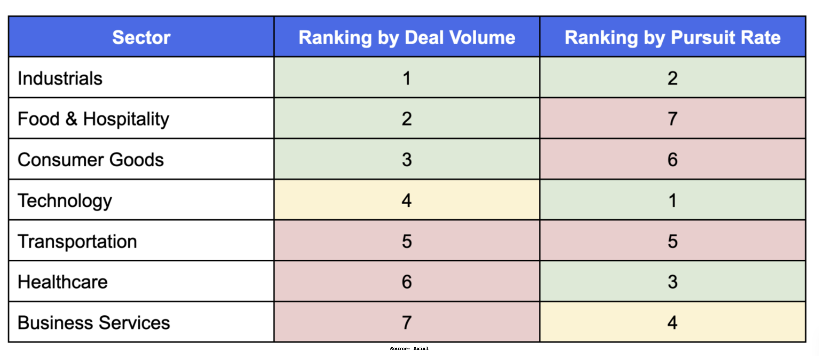 In the Technology sector, pursuit rates were notably high despite the sector ranking fourth in deal volume per Axial. This suggests that buyers are particularly interested in technological businesses, potentially due to their perceived growth potential and importance in a digital economy.
